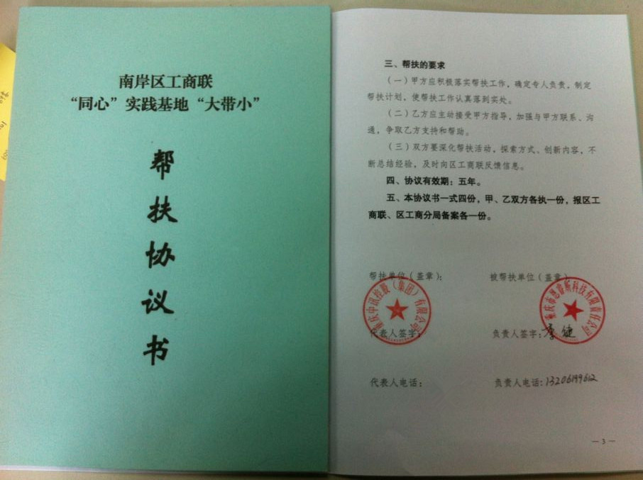為認(rèn)真貫徹落實(shí)“同心”思想,引導(dǎo)幫扶微小企業(yè)健康發(fā)展。經(jīng)黨支部牽線搭橋,中訊控股集團(tuán)在南岸區(qū)工商聯(lián)的見(jiàn)證下于2012年5月與重慶市長(zhǎng)靚光電科技有限公司、重慶市恩睿斯科技有限公司等4家微小企業(yè)簽訂幫扶協(xié)議。